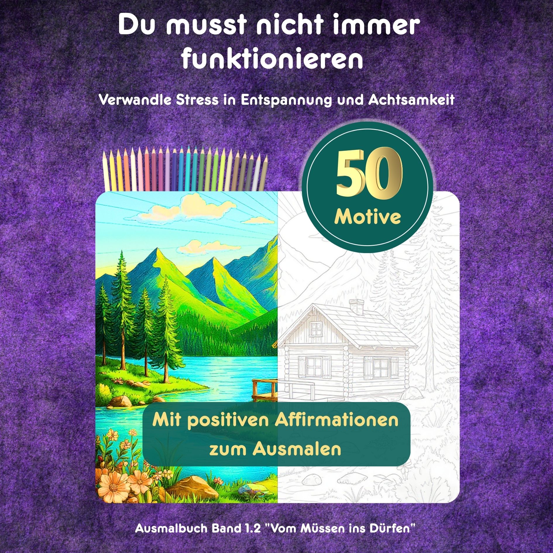 Dein Ausmalbuch „Vom Müssen ins Dürfen“ für mehr Achtsamkeit & Entspannung: 50 faszinierende Motive inklusive positiver Affirmationen. Gleich ausprobieren und innere Balance finden!